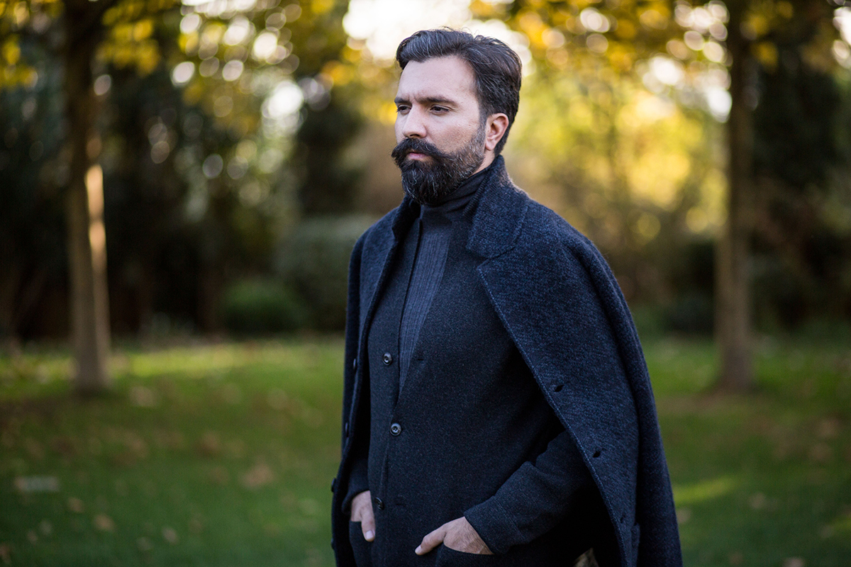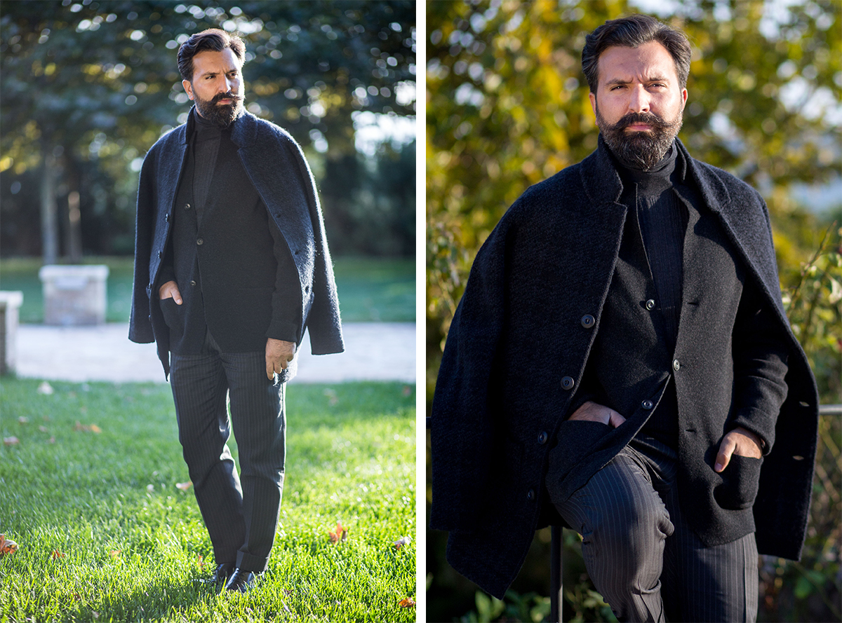 I chose to wear a coat and jacket combo both made of extra-fine merino wool. I combined them with a turtleneck jumper featuring a gorgeous textured rib knit, also made of highly-coveted, sophisticated merino wool, which is prized for its exceptionally fine fibers that create premium quality garments (I can say that it is particularly suitable for wearing against the skin, as it ventilates well and has a quite pleasant feel on the the body!). You can also read why you should choose quality sweaters here: The Turtleneck with Suit Look