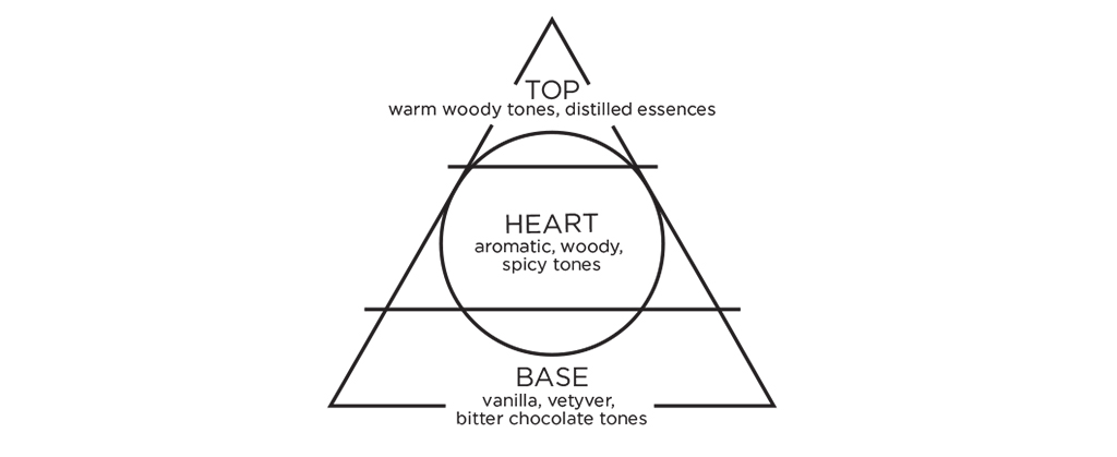 The first impression of warm woody tones and distilled essences offers its turn to the heart of the perfume – aromatic, woody and spicy tones. The base consisted of vanilla, vetyver, bitter chocolate and chocolate tones defines the duration and the overall character of the perfume, while through its contrast, it highlights the wittiness of the first impression.